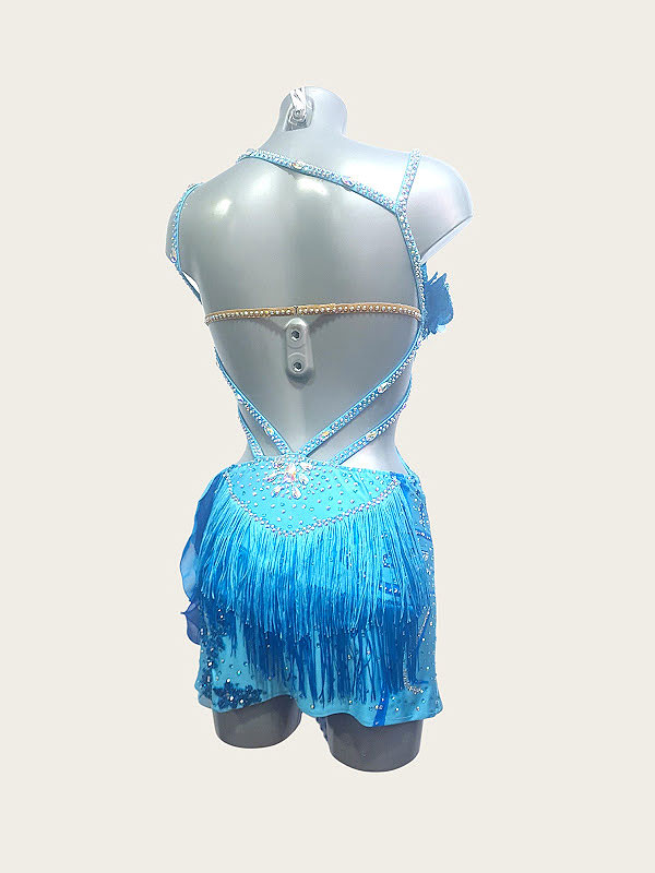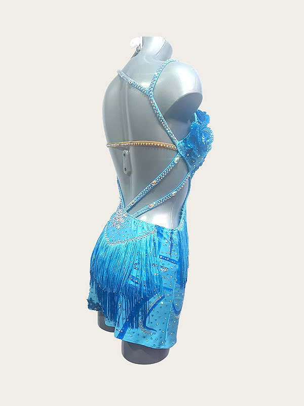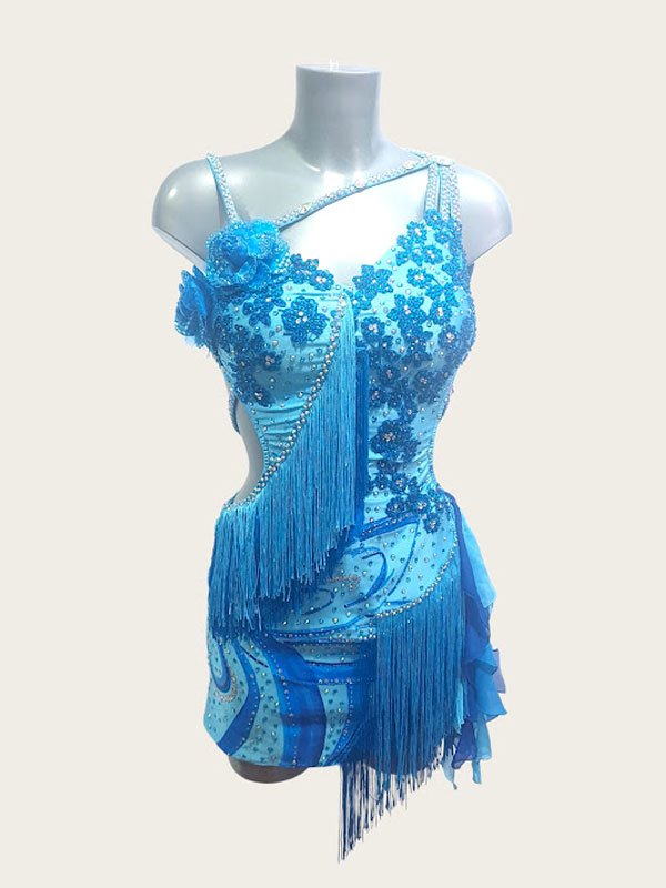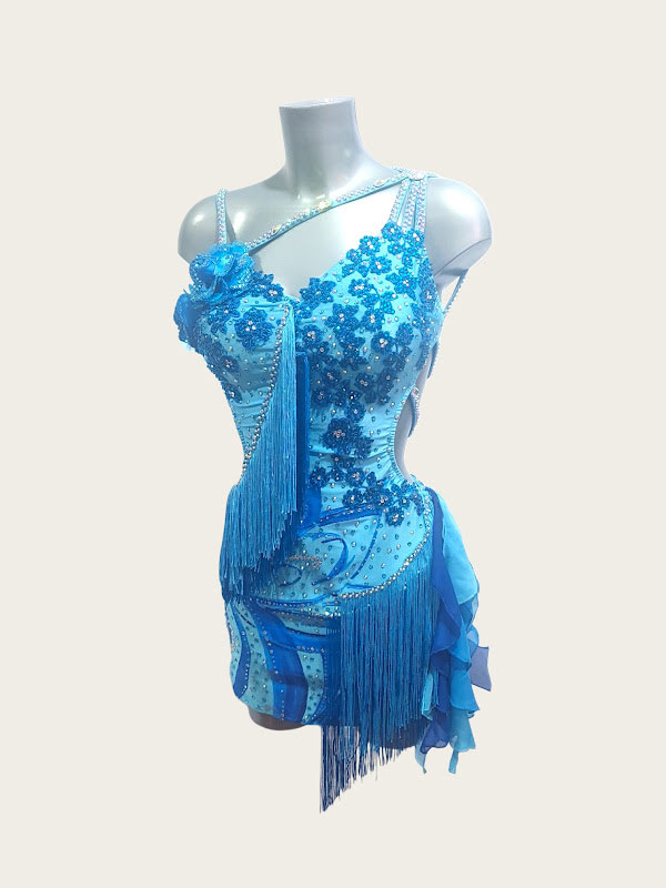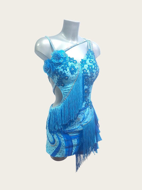 Blue Latin Dance Dress with Hand-Painted Details, 3D Roses & Fringe