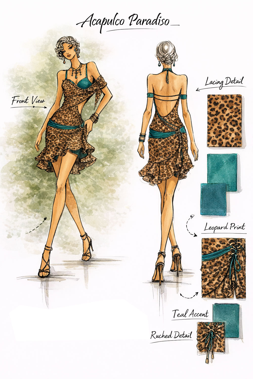 One side off-shoulder sexy leopard print latin dancing custom dress for a loosing top style. This latin sketch includes a body inside the dress.